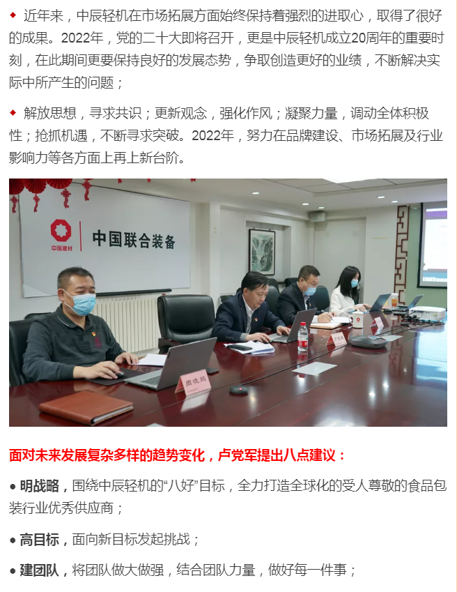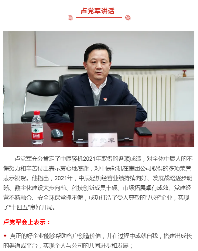 On the afternoon of January 28, Hefei Light Machinery and Zhongchen Light Machinery held their annual work conference and party風(fēng) and anti-corruption work conference. Lu Dangjun, the Party Secretary, Chairman, and General Manager of China United Equipment, attended the meeting via video and delivered an important speech. Liu Baosheng, the Party Committee member and Secretary of the Discipline Inspection Commission of China United Equipment, and Zhou Xiaopeng, Director of the Department of Enterprise Management, and Kang Zixuan, Deputy Director of the Department of Administration and Personnel, attended the meeting. Gao Yibing, the Party Committee member and Production Director of Zhongchen Light Machinery, presided over the meeting.
