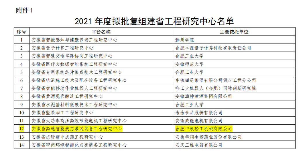 On January 17, the Development and Reform Commission of Anhui Province released the "Announcement of the Results of the 2021 Annual Review of Anhui Provincial Engineering Research Centers", and Zhongchen Light Machinery's application for the "Anhui Provincial High-speed Intelligent Liquid Filling Equipment Engineering Research Center" passed through rigorous selection processes, including expert review, on-site presentation, and the Director's Office Meeting of the Anhui Provincial Development and Reform Commission, and finally successfully made the list.