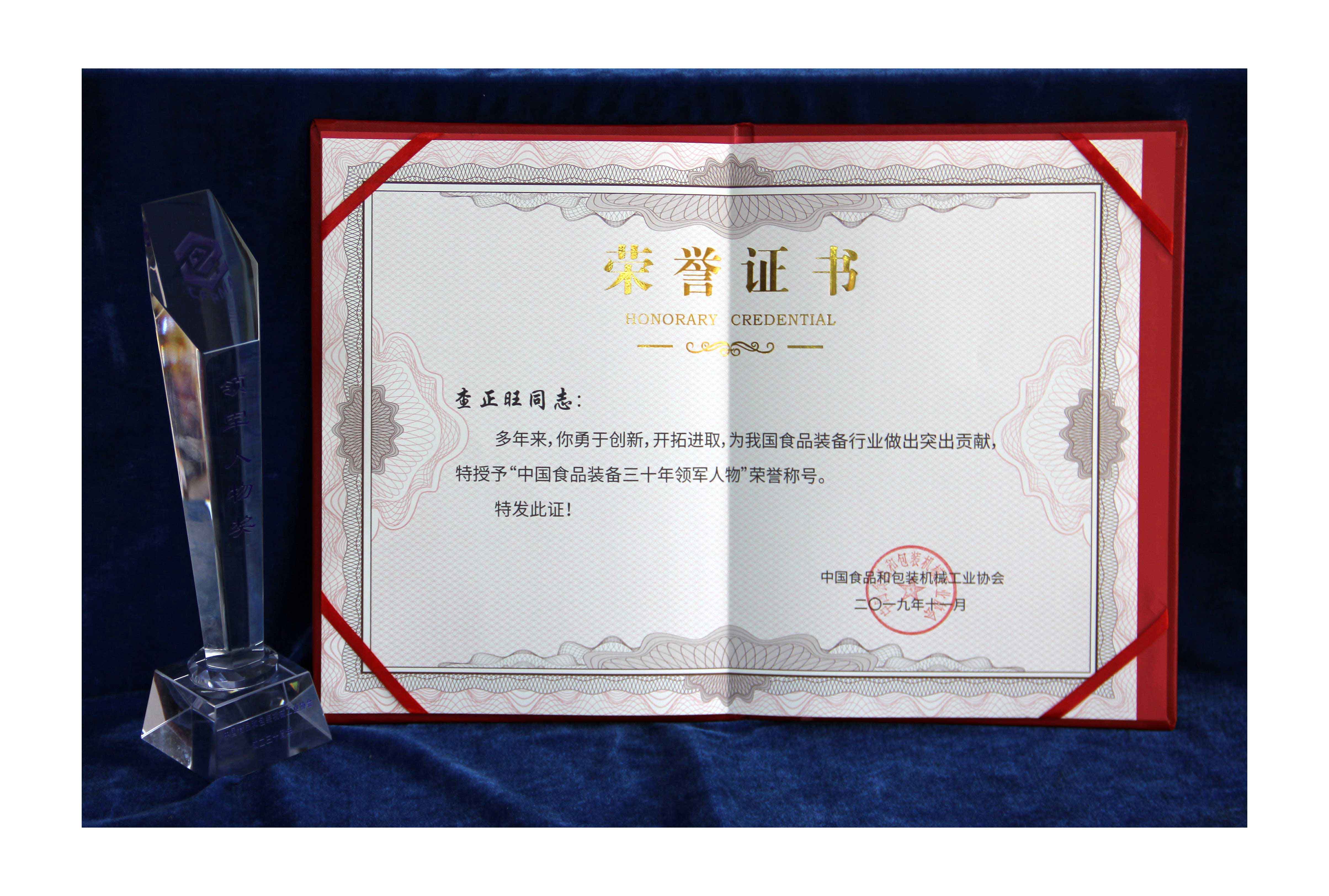 中國食品和包裝工業(yè)協(xié)會授予合肥中辰輕機(jī)董事長查正旺“中國食品裝備30年領(lǐng)軍人物”榮譽(yù)稱號,以表彰其多年來勇于創(chuàng)新,開拓進(jìn)取,為我國食品裝備行業(yè)做出的突出貢獻(xiàn)。