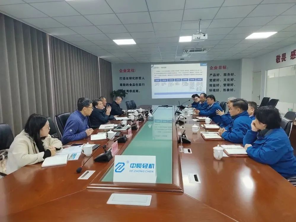 On November 16, Hefei Economic and Information Commission Deputy Director-General Ke Wenbin, Director of the Industrial Internet Department of Hefei Economic and Information Commission Zhao De, and other officials from the department visited Zhongchen Light Machinery for research and guidance. Director of Economic and Information Commission of Hefei City Yan Yang, Director of the Anhui Branch of the China Industrial Internet Institute Wang Xu, Director of the Industrial Internet Department of Hefei Economic and Information Commission Guo Jianglin, and Wang Qinzi from the Industrial Internet Department of the Anhui Economic and Information Commission also accompanied the visit. Zhongchen Light Machinery's Party Secretary, Chairman, President, and General Manager Zha Charong, Deputy General Manager He Sheng, and other senior management team members and leaders of the Information Planning Department received and accompanied the visit.